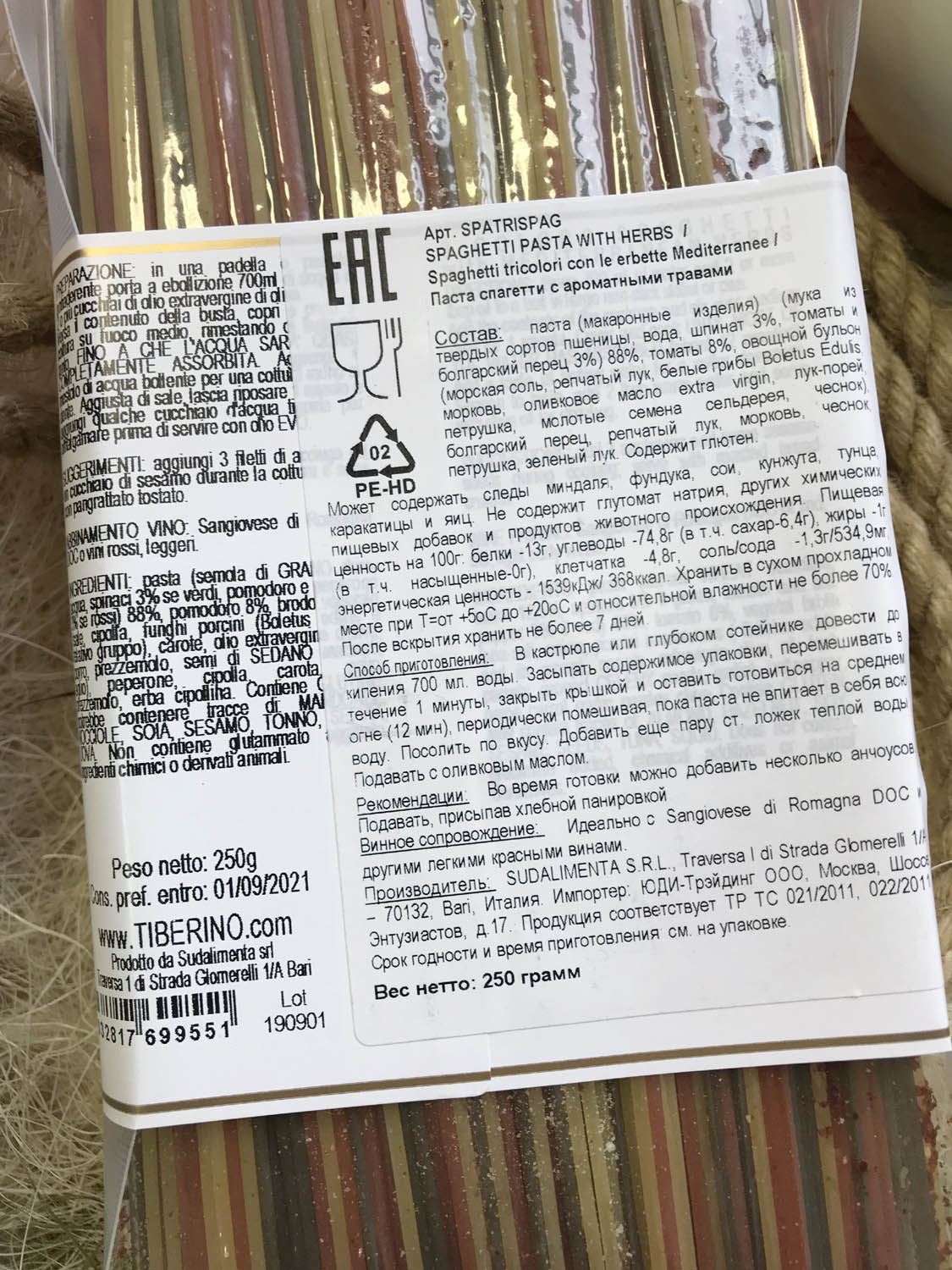 | Оригинальное наименование | SPAGHETTI TRICOLORI CON LE ERBETTE MEDITERRANEE 250G |