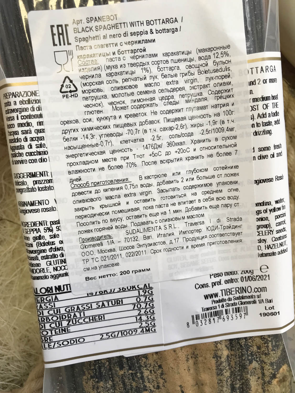 | Оригинальное наименование | SPAGHETTI AL NERO DI SEPPIA & BOTTARGA 200G |