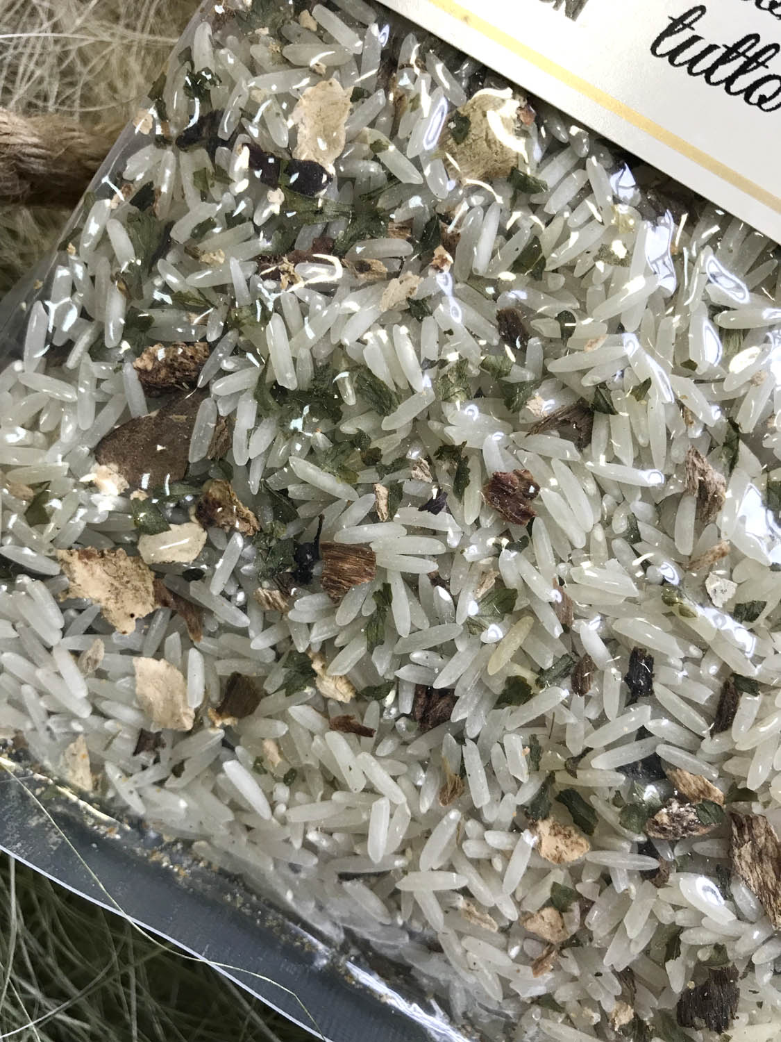 Рис басмати 93%, белые грибы Boletus Edulis 4%, овощной бульон (морская соль, репчатый лук, белые грибы Boletus Edulis, морковь, оливковое масло extra virgin, лук-порей, петрушка, молотые семена сельдерея, чеснок), чеснок, петрушка. Может содержать следы глютена, миндаля, фундука, сои, кунжута, тунца, каракатицы и яиц. Не содержит глутамат натрия, других химических пищевых добавок и продуктов животного происхождения.