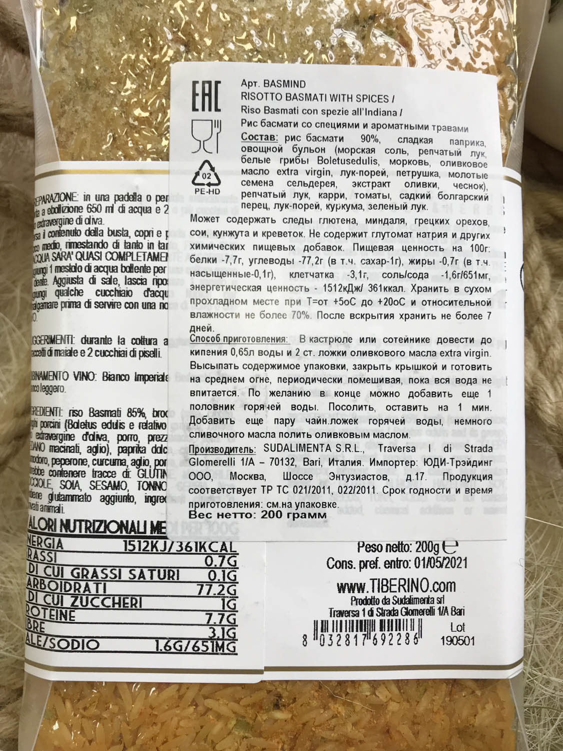 | Оригинальное наименование | RISO BASMATI CON SPEZIE ALL'INDIANA 200G |