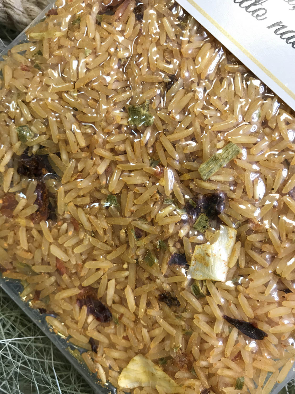 Рис басмати 92%, овощной бульон (морская соль, репчатый лук, белые грибы Boletus Edulis, морковь, оливковое масло extra virgin, лук-порей, петрушка, молотые семена сельдерея, чеснок), морковь, сладкая паприка, репчатый лук, карри, томаты, сладкий болгарский перец, куркума, лук-порей, чеснок, зеленый лук. Может содержать следы глютена, миндаля, фундука, сои, кунжута, тунца, каракатицы и яиц. Не содержит глутамат натрия, других химических пищевых добавок и продуктов животного происхождения.