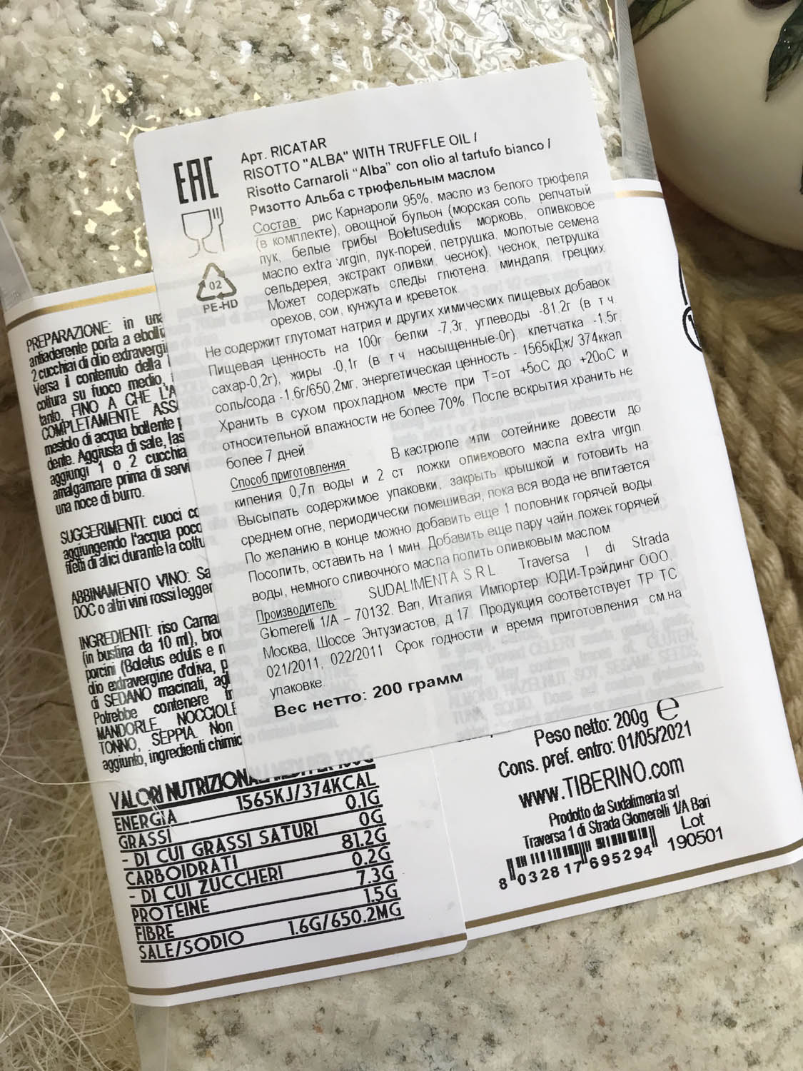 | Оригинальное наименование | RISOTTO CARNAROLI "ALBA" CON OLIO AL TARTUFO BIANCO 200G |