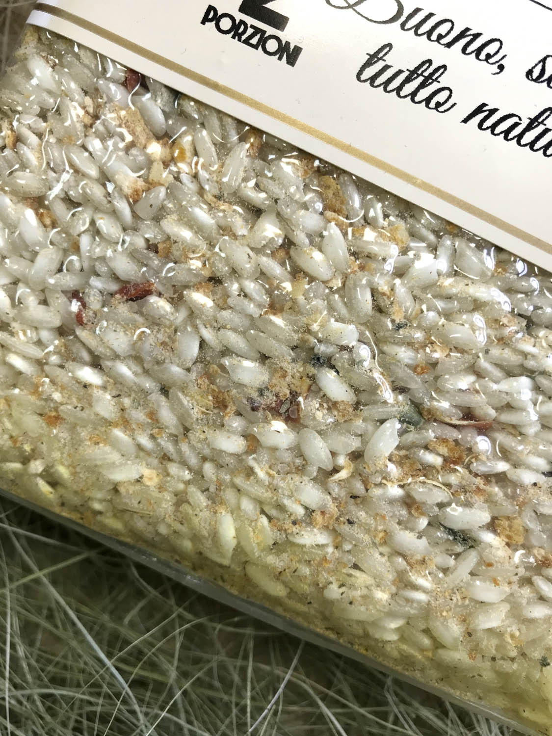 Рис Карнароли, цедра апельсина, морковь, овощной бульон (морская соль, репчатый лук, белые грибы Boletus Edulis, морковь, оливковое масло extra virgin, лук-порей, петрушка, молотые семена сельдерея, экстракт оливки, чеснок), куркума, зеленый лук, петрушка. Может содержать следы глютена, миндаля, грецких орехов, сои, кунжута и креветок. Не содержит глутамат натрия и других химических пищевых добавок.