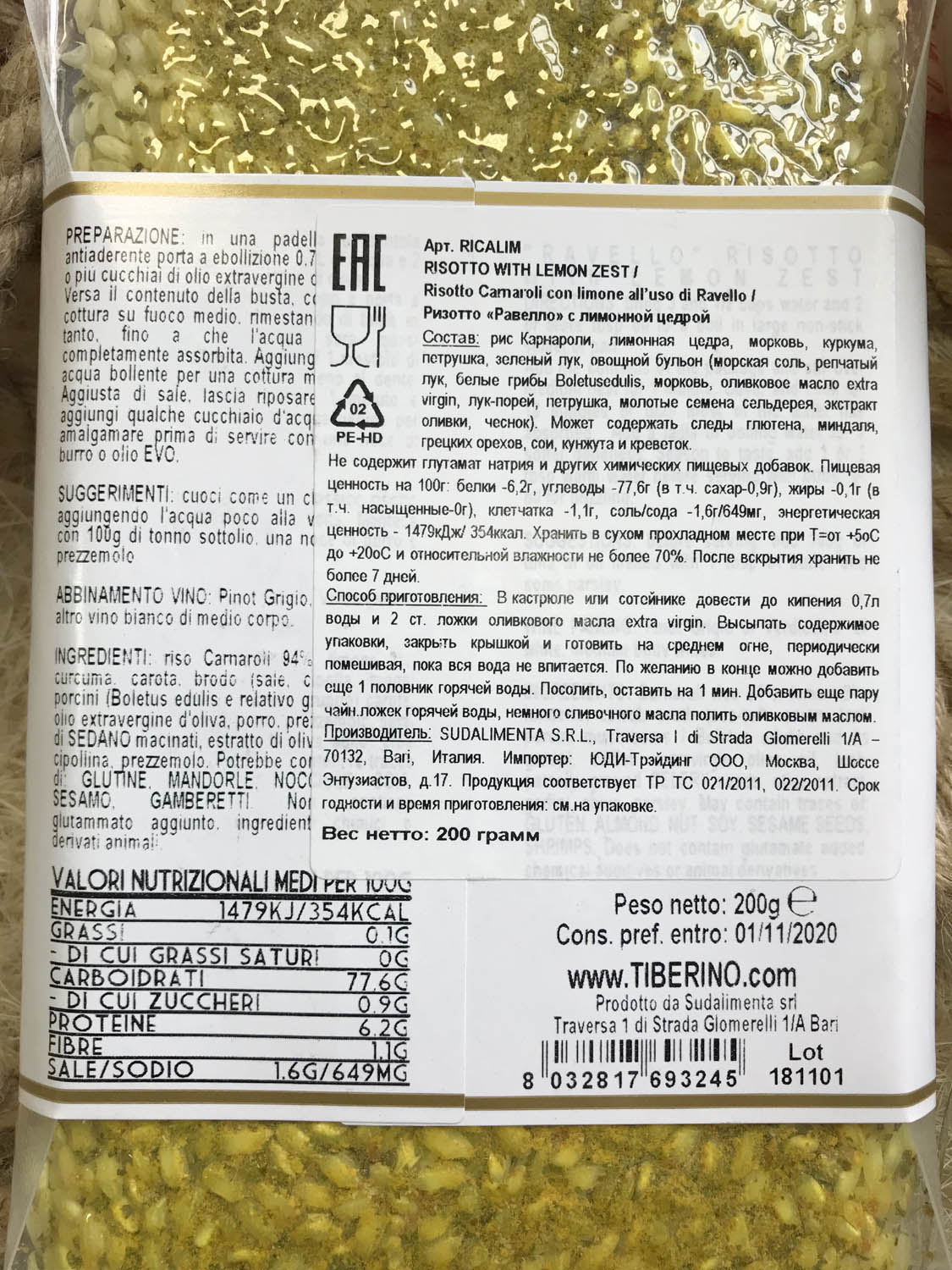 | Оригинальное наименование | RISOTTO CARNAROLI CON LIMONE ALL'USO DI RAVELLO 200G |