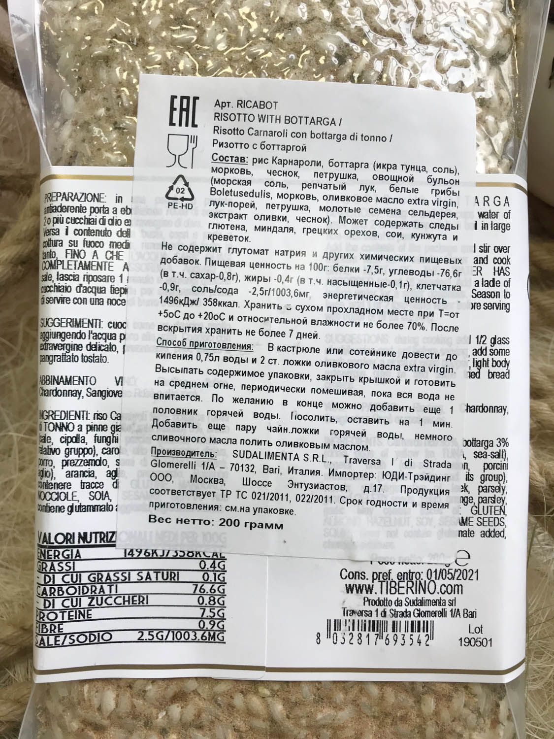 | Оригинальное наименование | RISOTTO CARNAROLI CON BOTTARGA 200G |