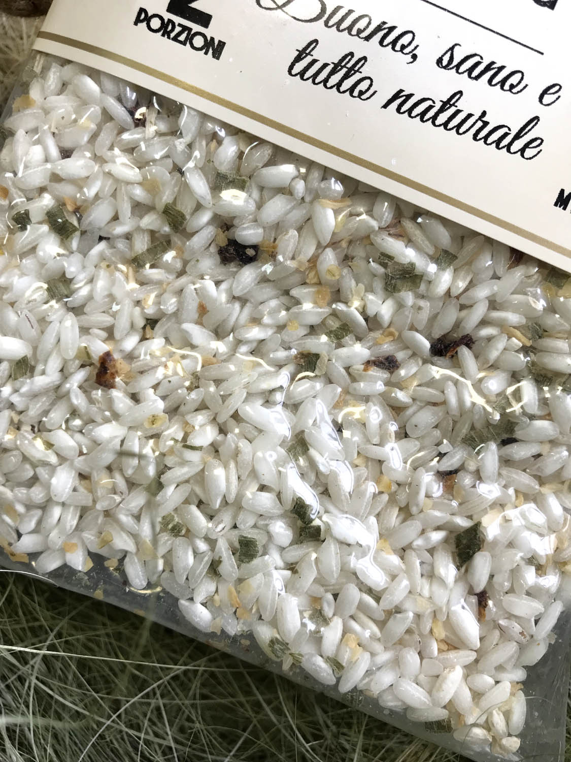 Рис Карнароли 90%, репчатый лук 5%, овощной бульон (морская соль, репчатый лук, белые грибы Boletus Edulis, морковь, оливковое масло extra virgin, лук-порей, петрушка, молотые семена сельдерея, чеснок) томаты, изюм 2%, зеленый лук. Может содержать следы глютена, миндаля, фундука, сои, кунжута, тунца, каракатицы и яиц.Не содержит глутамат натрия, других химических пищевых добавок и продуктов животного происхождения.