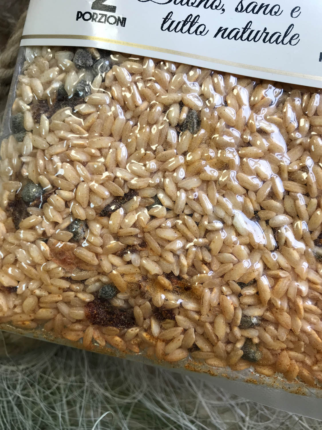 Рис Карнароли 92%, сладкий болгарский перец 4%, овощной бульон (морская соль, репчатый лук, белые грибы Boletus Edulis, морковь, оливковое масло extra virgin, лук-порей, петрушка, молотые семена сельдерея, чеснок), каперсы 2%, репчатый лук, сладкая паприка. Может содержать следы глютена, миндаля, фундука, сои, кунжута, тунца, каракатицы и яиц.Не содержит глутамат натрия, других химических пищевых добавок и продуктов животного происхождения.