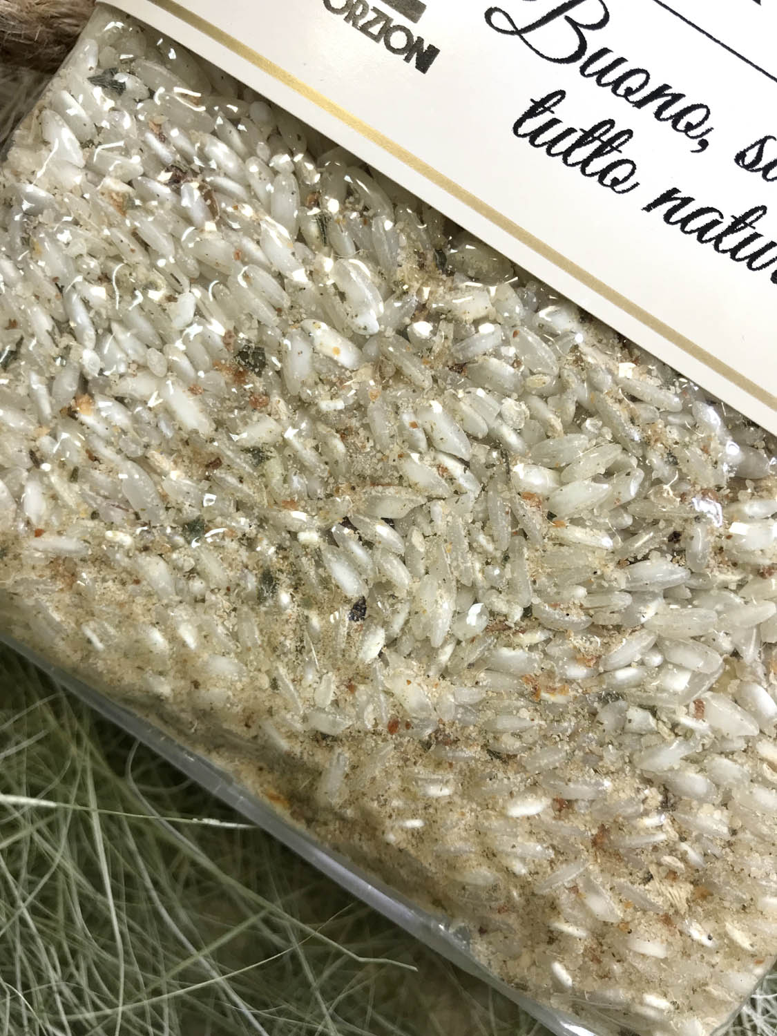 Рис Карнароли 92%, артишоки 4%,овощной бульон (морская соль, репчатый лук, белые грибы Boletus Edulis, морковь, оливковое масло extra virgin, лук-порей, петрушка, молотые семена сельдерея, чеснок), петрушка, чеснок, перец. Может содержать следы глютена, миндаля, фундука, сои, кунжута, тунца и каракатицы. Не содержит глутамат натрия, других химических пищевых добавок и продуктов животного происхождения.