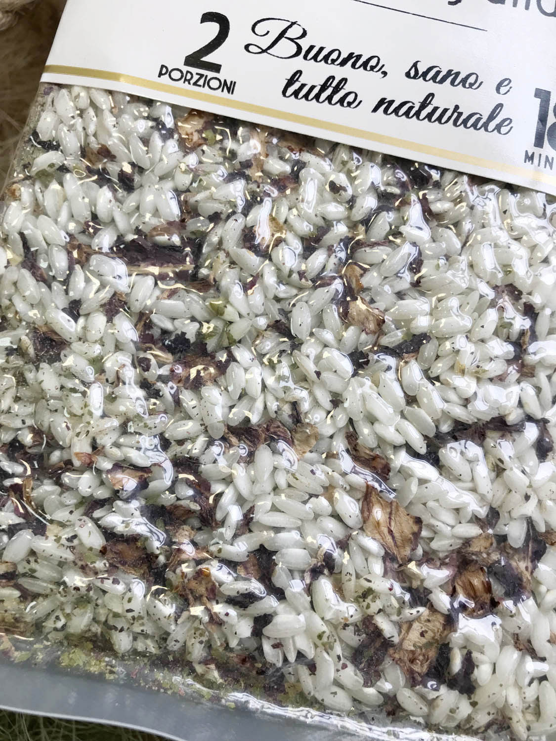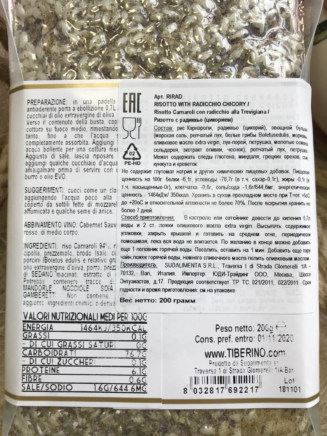 Рис Карнароли, радиккьо (цикорий), овощной бульон ( морская соль, репчатый лук, белые грибы Boletusedulis, морковь, оливковое масло extra virgin, лук-порей, петрушка, молотые семена сельдерея, экстракт оливки, чеснок), репчатый лук, петрушка. Может содержать следы глютена, миндаля, грецких орехов, сои, кунжута и креветок. Не содержит глутамат натрия и других химических пищевых добавок.