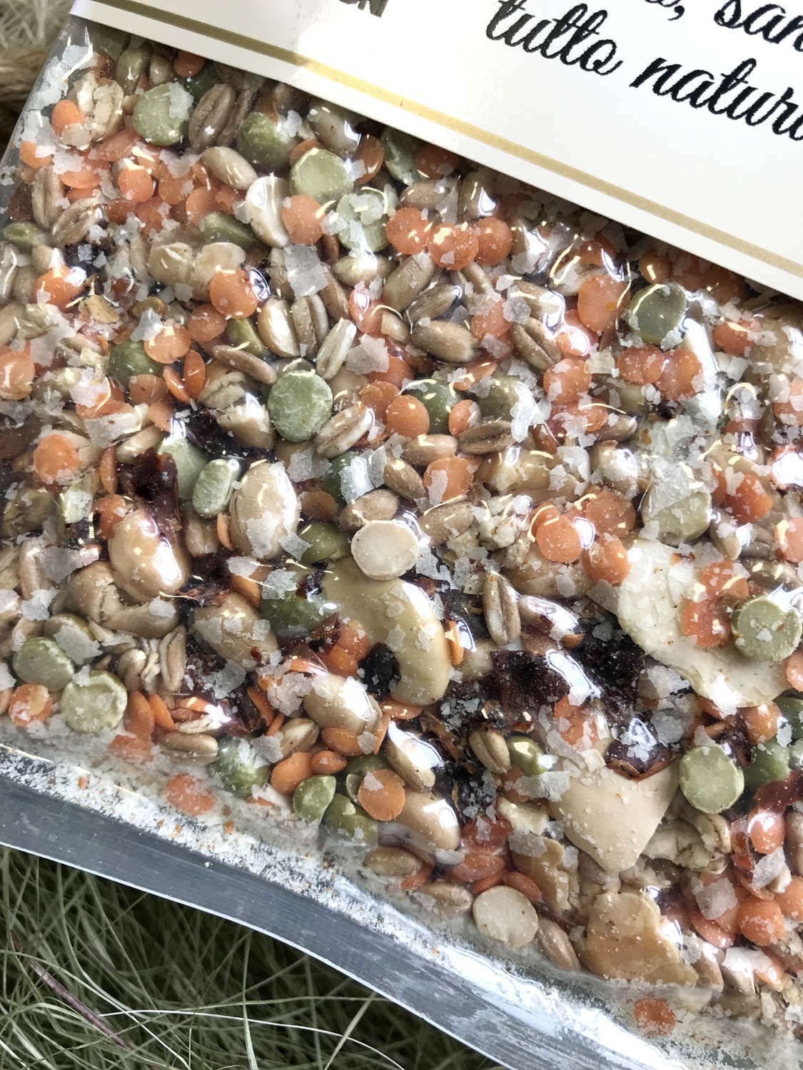 Бобы (24%), горох (23%), чечевица (21%), микс фасоли (17%), полба (14%), овощной бульон (морская соль, репчатый лук, белые грибы Boletus Edulis, морковь, оливковое масло extra virgin, лук-порей, петрушка, молотые семена сельдерея, чеснок) (1%). Содержит глютен. Может содержать следы миндаля, фундука, сои, кунжута, тунца, каракатицы, яиц. Не содержит глутамат натрия, других химических пищевых добавок и продуктов животного происхождения.