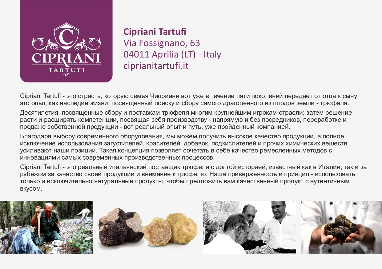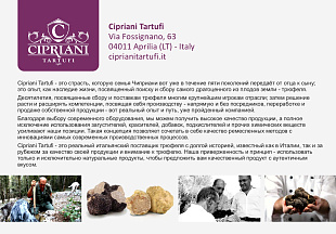 Cipriani Tartufi - это реальный итальянский поставщик трюфеля с долгой историей, известный как в Италии, так и за рубежом за качество своей продукции и внимание к трюфелю. Наша приверженность и принцип - использовать только и исключительно натуральные продукты, чтобы предложить вам качественный продукт с аутентичным вкусом.