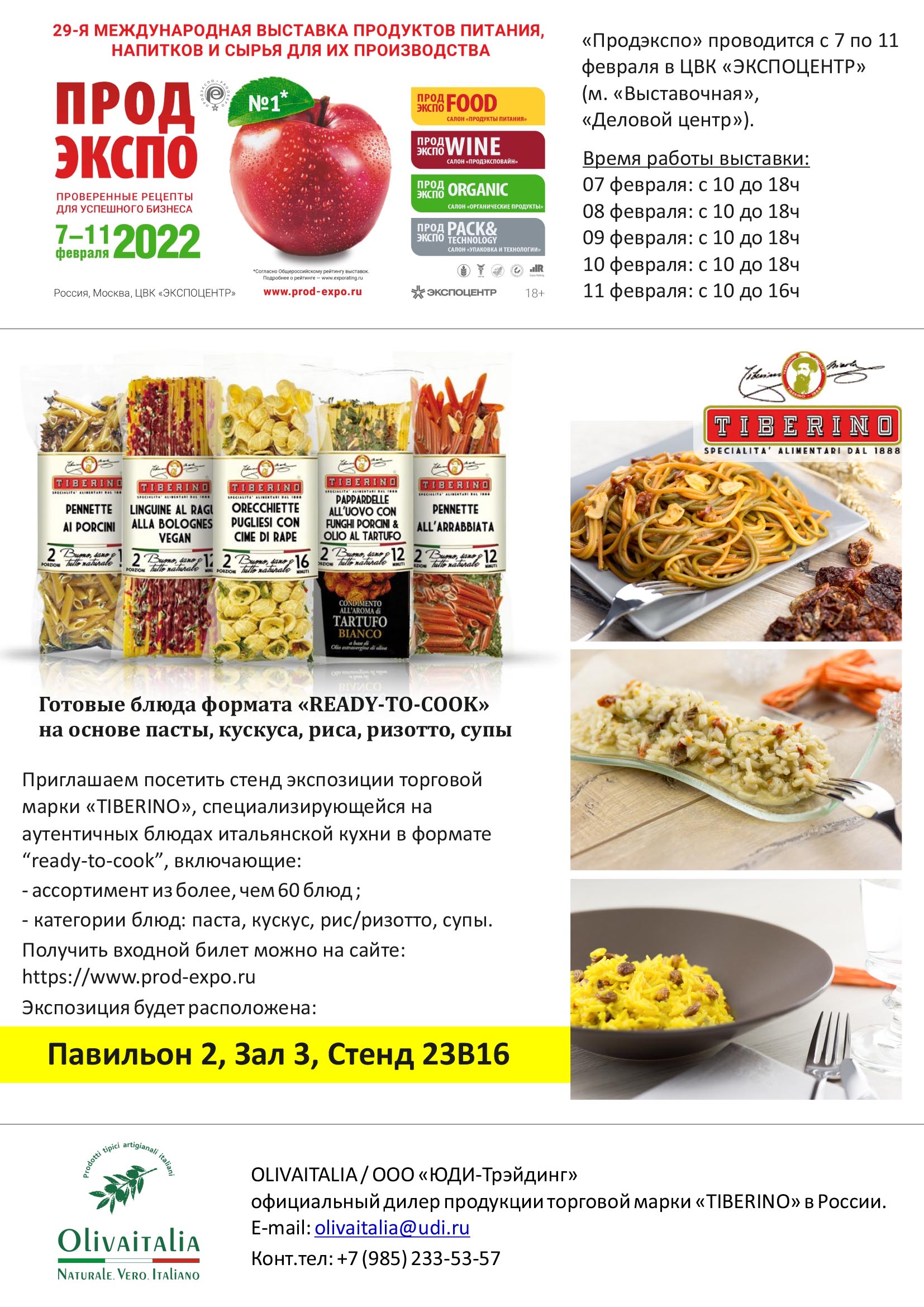 С 07 по 11 февраля 2022г. в ЦВК "Экспоцентр" состоится 29-я международная выставка продуктов питания, напитков и сырья для их производства - "Продэкспо 2022". "ОливаИталия" примет участие в мероприятии на стенде торговой марки "TIBERINO" (Италия), (павильон 2, зал 3, стенд 23B16).