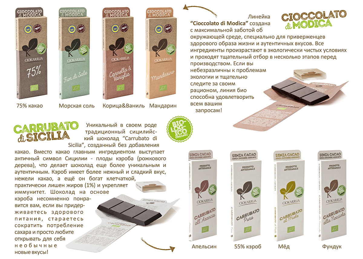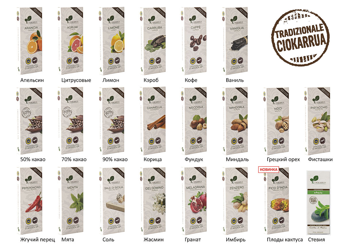 - традиционную серия "Tradizionale Ciokarrua", включающая более 20-ти различных вкусов. Шоколад из Модики "Ciokarrua" заслужил почетную отметку географического наименования продукции IGP (Indicazione Geografica Protetta). Ещё одно подтверждение высочайшего качества продукции "Ciokarrua" ! ;