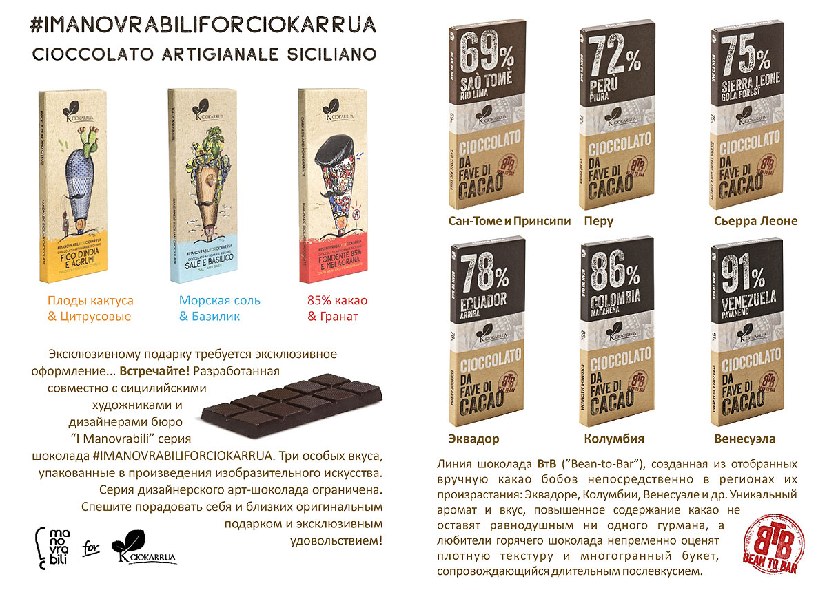 - супер-премьера: шоколад #IMANOVRABILIFORCIOKARRUA. Это совместный проект сицилийских дизайнеров и Ciokarrua. Эксклюзивная, ограниченная серия - для гурманов и не только. Плитка шоколада #IMANOVRABILIFORCIOKARRUA добавить свежих нот для особого случая или выступит превосходным, оригинальным комплиментом !